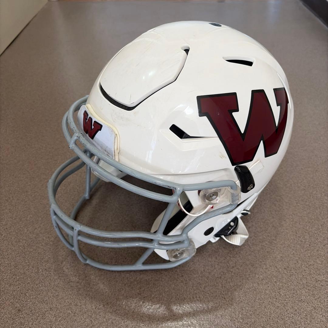 Riddell 製のホワイトアメリカンフットボールヘルメット、Mサイズです。チンベルト、スピードフレックス付き。引退された方の予備を譲り受けたため、ほぼ新品同様の綺麗さとなっております。写真欄に内容物と情報については掲載しております。