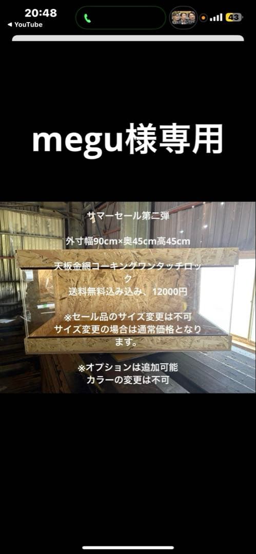 ゆこケージ制作に20日前後お時間を頂きます。画像は有りませんので他の画像を使わせて頂きます。アカシア集成材を使用していますので高級感の有るケージに仕上がっております。爬虫類小動物用木製ケージ木材蜜蝋オイル仕上げ工房トロハウスオーダーメイドどのようなサイズ、仕様でも承ります。お気軽にご相談して下さい。サイズ:幅120×縦45×奥行60(大型サイズ)素材:アカシア集成材15ミリ板使用(板厚15ミリ)頑丈ですので大型爬虫類にも対応しています。カラー:淡褐色(天然色)複数段積み重ね対応地震時、積重ね時の落下防止の連結金具付特徴:ビス留め箇所は全て木栓目隠し。上蓋下部にクリップ留めを設置し、紫外線ライトや保温器具などを好みの場所に設置可能。側面には開閉式通気孔を左右両側に設置裏面には配線穴を左右2個配置。通気性・配線性が抜群。表側は透明な硝子板(3ミリ厚)のスライド引き戸下面トレイはアルミ複合板を使用。耐久性にすぐれお手入れも容易に出来ます。天板内側に補強&クリップ止めを設置。紫外線ライトなどどの位置でも取付可能。外側全面に天然由来の木材用オイル美しい仕上がを実現。(光沢と傷防止)このケージは、ペットがストレスなく過ごせるように、通気性や開閉性にこだわりました。お部屋に置いても違和感がありません。ペットの愛好家にとって最高の選択肢となるでしょう。不明な点はご質問ください。※商品やお取引に関する疑問点などお気軽にコメントください。